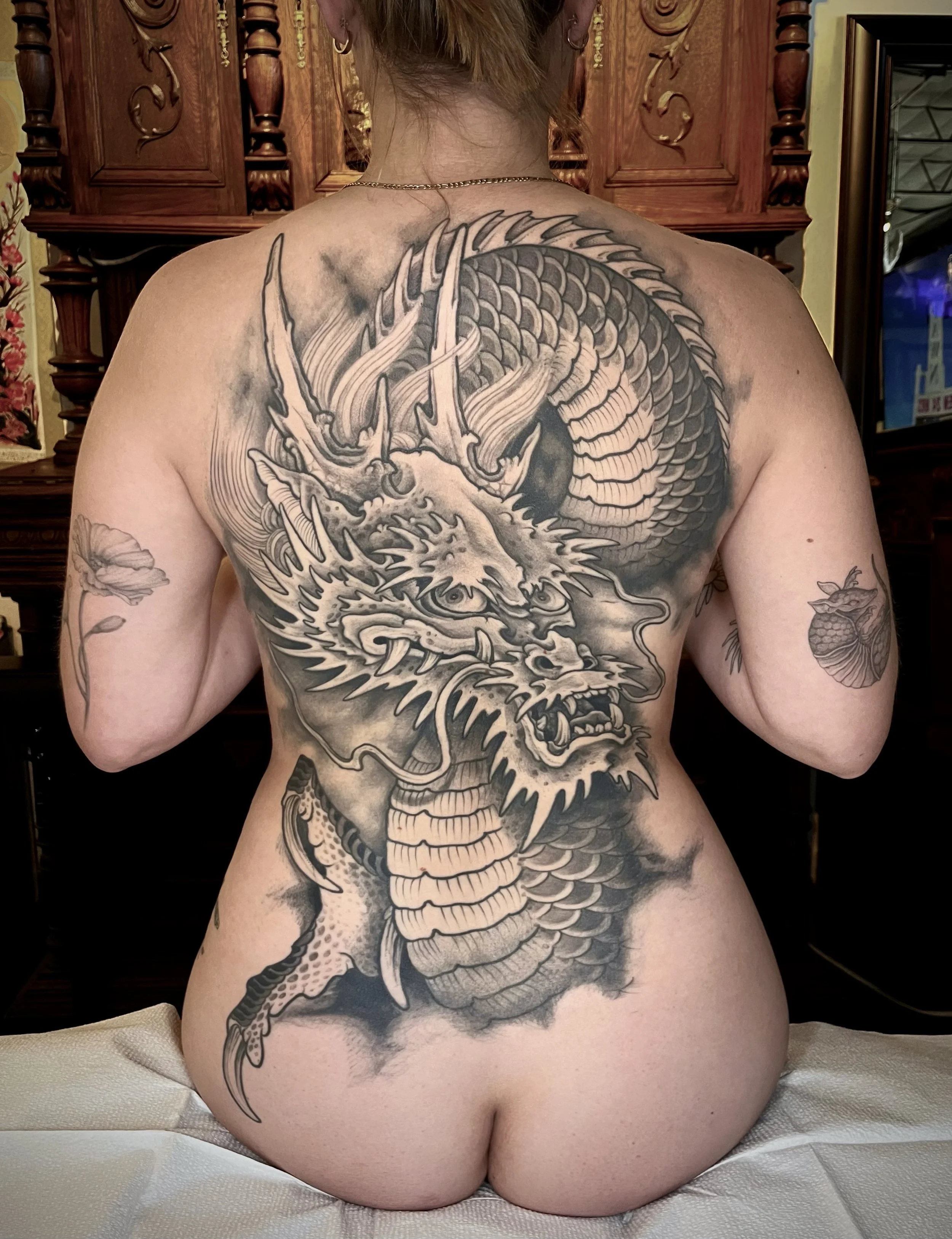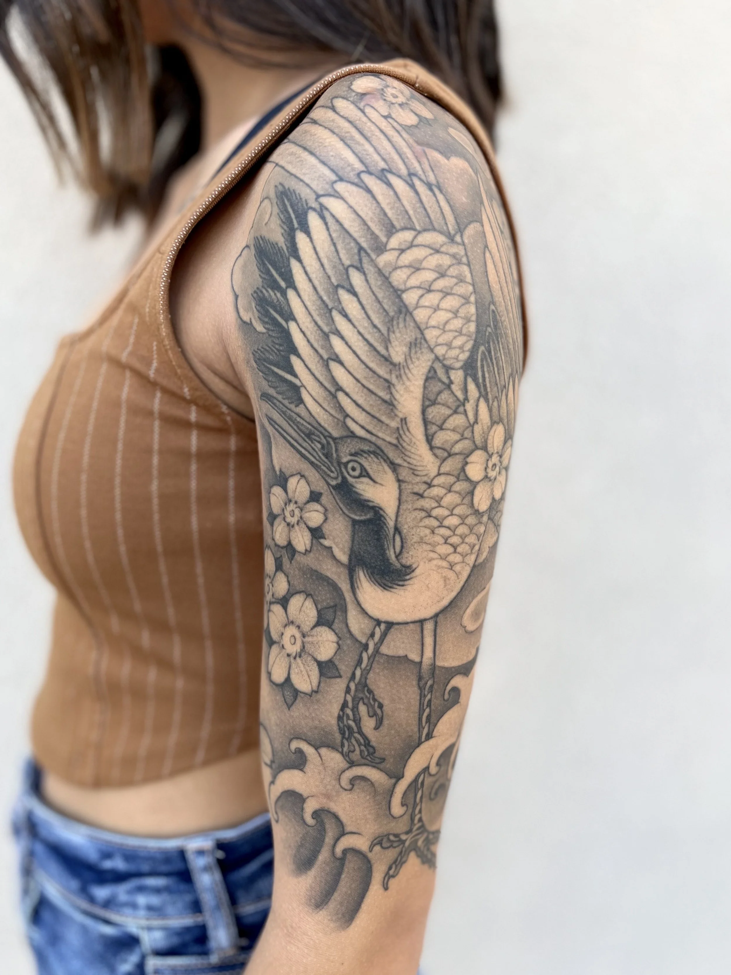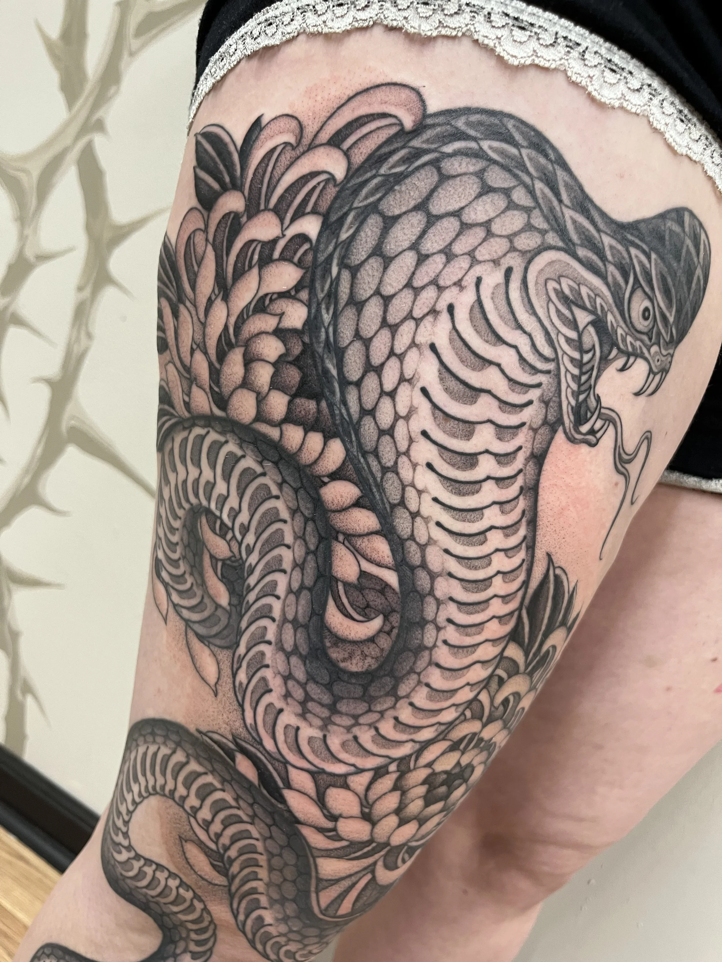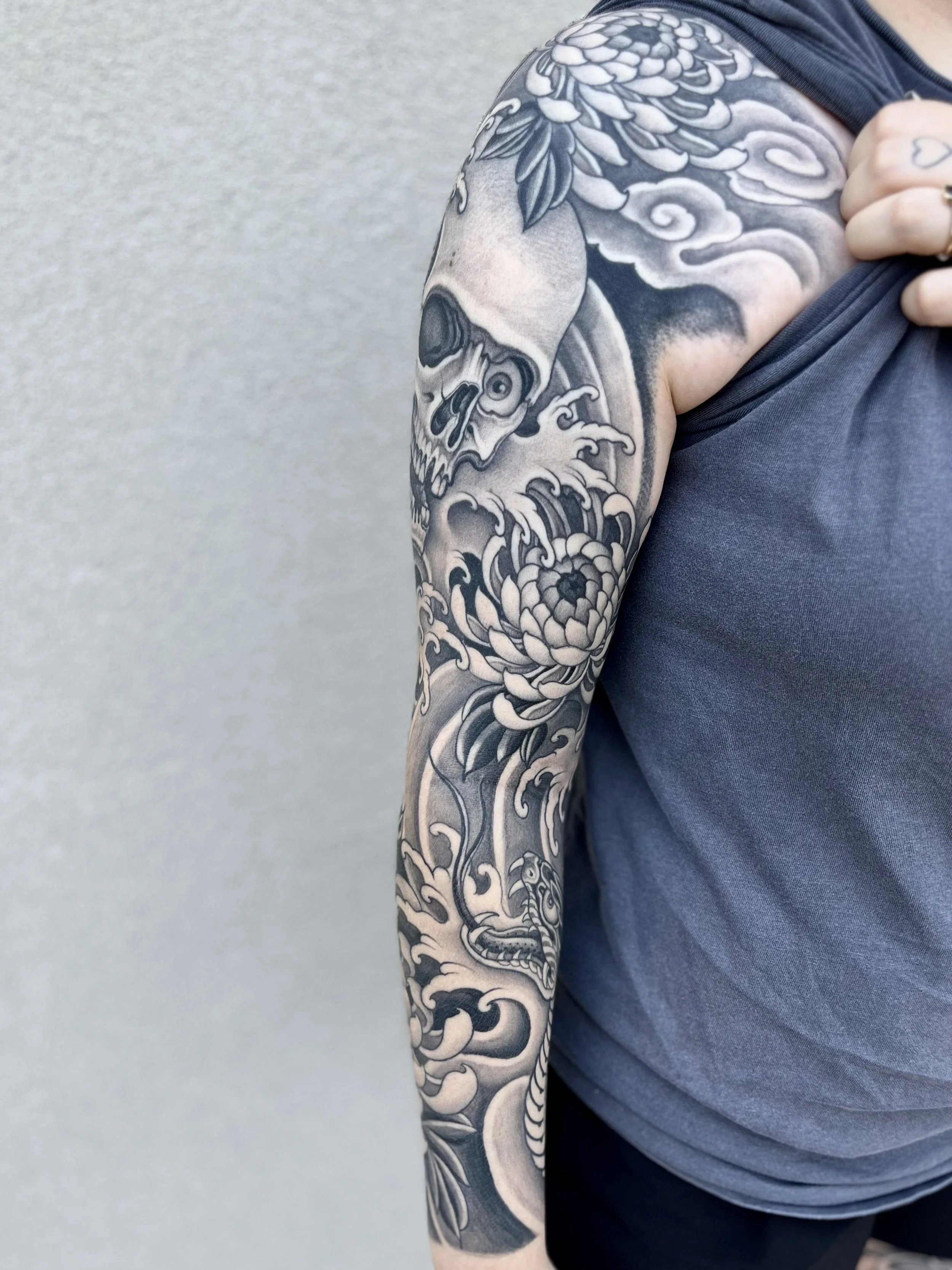 Simon primarily focuses on displaying his favorite elements of nature, florals and animals through elegant black and grey work as well as Japanese influenced tattoos.